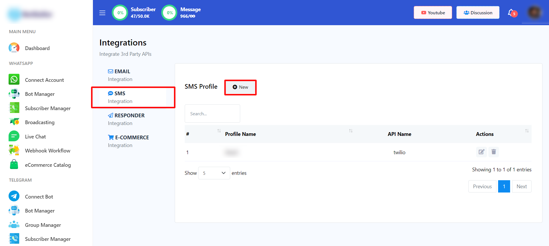 - Click the `New` button next to the SMS section. This will take you to the SMS integration.