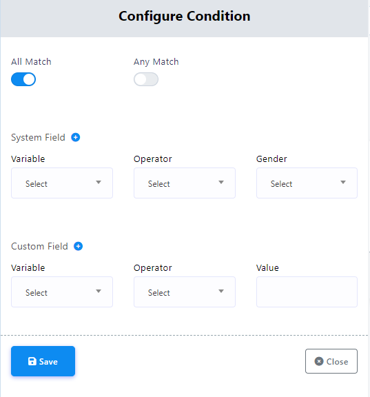 - Within the Condition component settings, users have the choice of using two radio buttons: `All Match` and `Any Match`. These options dictate whether all specified conditions must be simultaneously met or if any one of them is adequate to initiate a particular action or response.