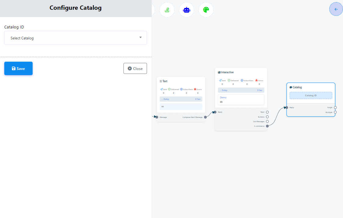 - After adding the `Catalog` element to your flow, Double-click on the catalog element. This will reveal the `Catalog ID` field, allowing you to input your WhatsApp catalog id.